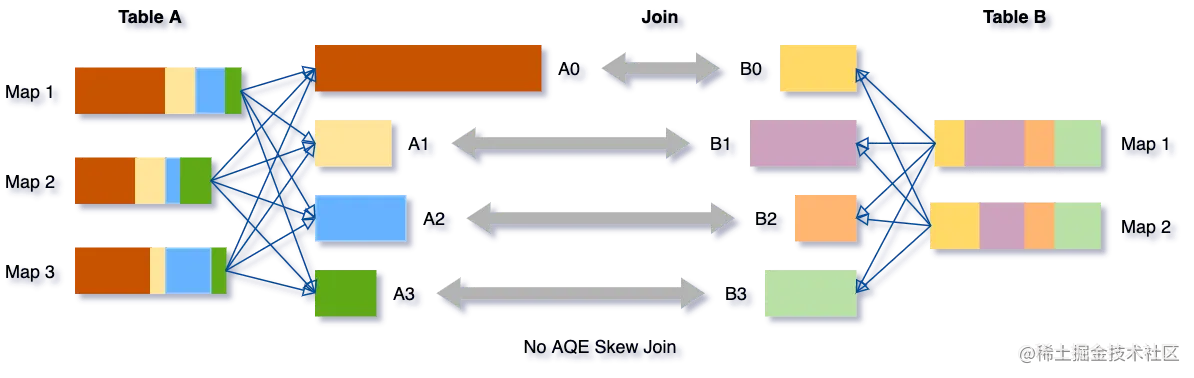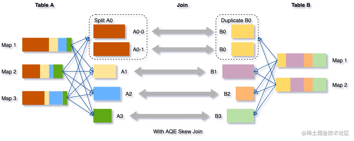 倾斜Join优化的目的是让倾斜的 Partition 由更多的 Reducer 去处理,从而避免长尾。具体而言,在 Shuffle Write 结束之后,AQE 框架统计每个 Partition 的 Size,接着根据特定规则判断是否存在倾斜,若存在,则把该 Partition 分裂成多个 Split,每个 Split 跟另外一张表的对应 Partition 做 Join。如下所示。