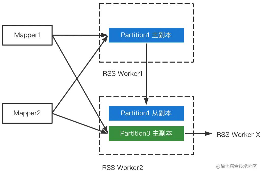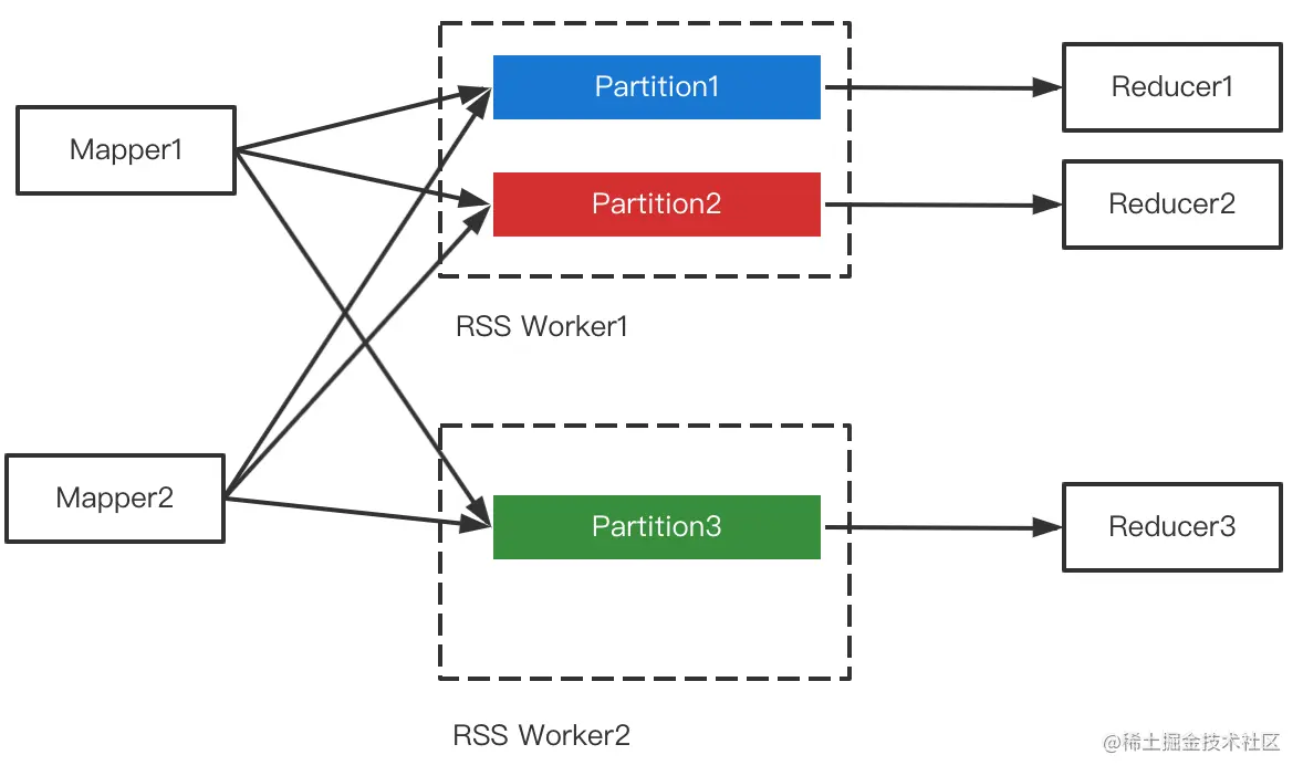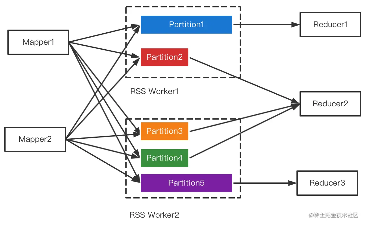 RSS 的核心设计是 Push Shuffle + Partition 数据聚合,即不同的 Mapper 把属于同一个 Partition 的数据推给同一个 Worker 做聚合,Reducer 直读聚合后的文件。如下图所示。