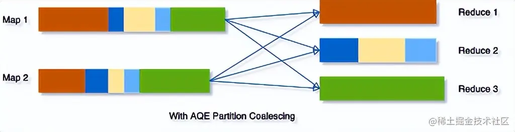 Partition 合并的目的是尽量让 reducer 处理的数据量适中且均匀,做法是首先 Mapper按较多的 Partition 数目进行 Shuffle Write,AQE 框架统计每个 Partition 的 Size,若连续多个 Partition 的数据量都比较小,则将这些 Partition 合并成一个,交由一个 Reducer 去处理。过程如下所示。
