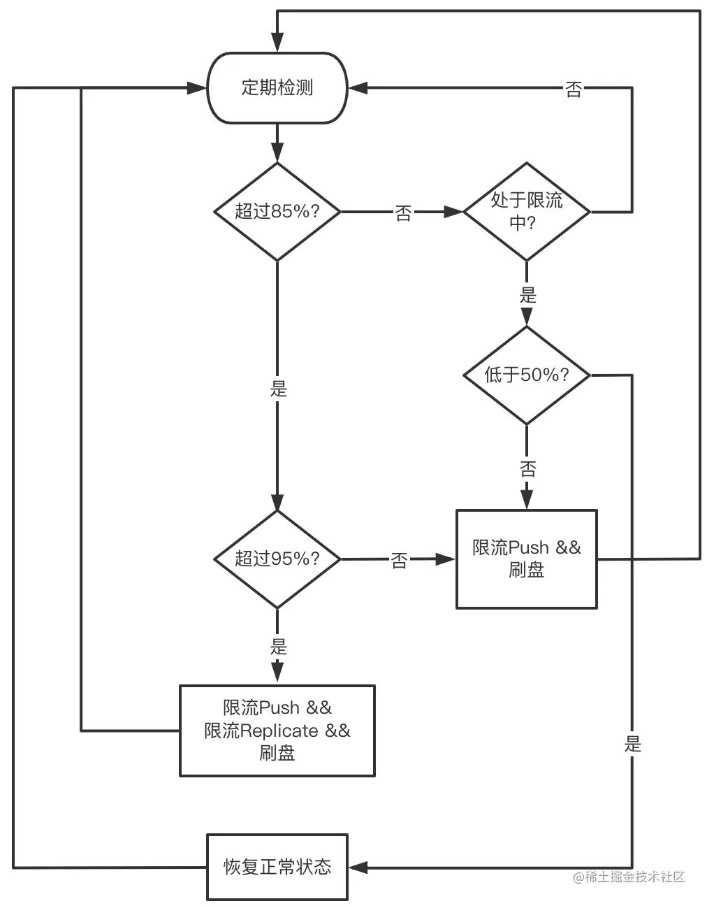 我们在设计流控策略时,不仅要考虑限流(降低流入的数据),更要考虑泄流(内存能及时释放)。具体而言,高水位我们定义了两档内存阈值(分别对应85%和95%内存使用),低水位只有一档(50%内存使用)。达到高水位一档阈值时,触发流控,暂停接收 Mapper 推送的数据,同时强制刷盘,从而达到泄流的目标。仅限制来自 Mapper 的流入并不能控制来自主副本的流量,因此我们定义了高水位第二档,达到此阈值时将同时暂停接收主副本发送的数据。当水位低于低水位后,恢复正常状态。整体流程如下图所示。