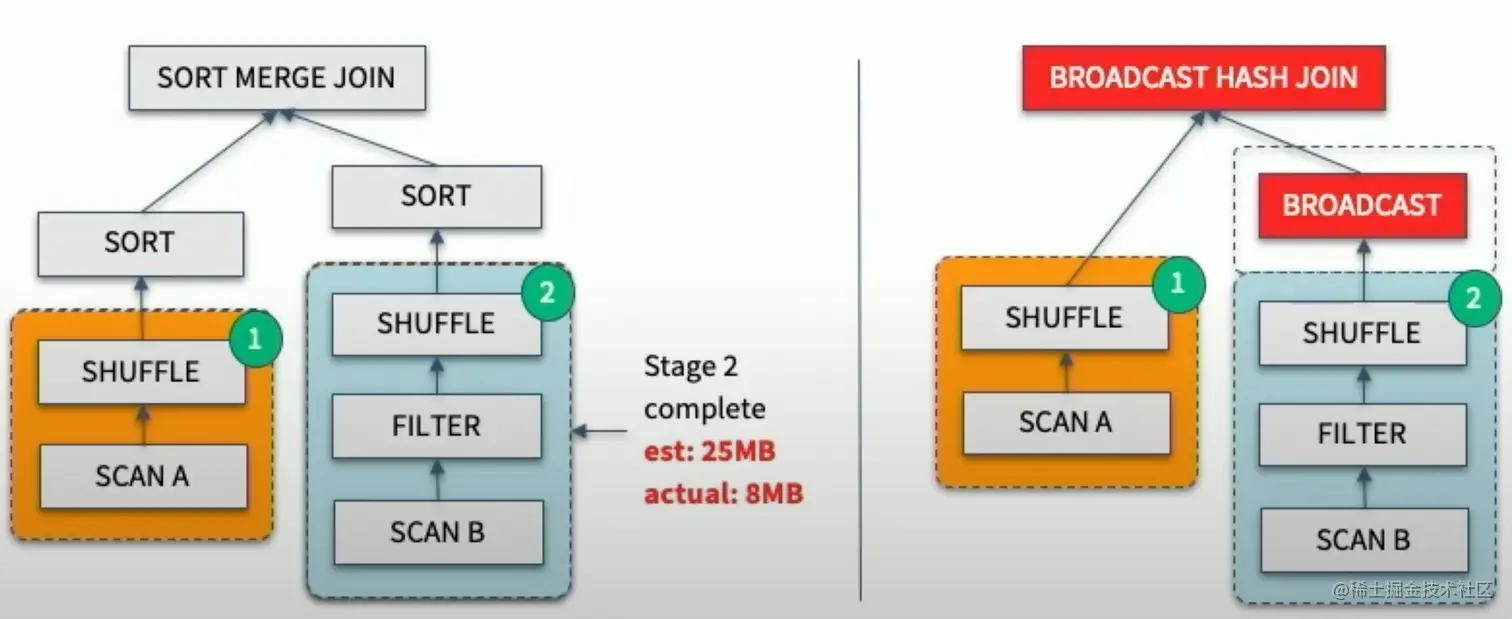 Join 策略切换的目的是修正由于 Stats 预估不准导致 Optimizer 把本应做的 Broadcast Join 错误的选择了 SortMerge Join 或 ShuffleHash Join。具体而言,在 Join 的两张表做完 Shuffle Write 之后,AQE 框架统计了实际大小,若发现小表符合 Broadcast Join 的条件,则将小表 Broadcast 出去,跟大表的本地 Shuffle 数据做 Join。流程如下: