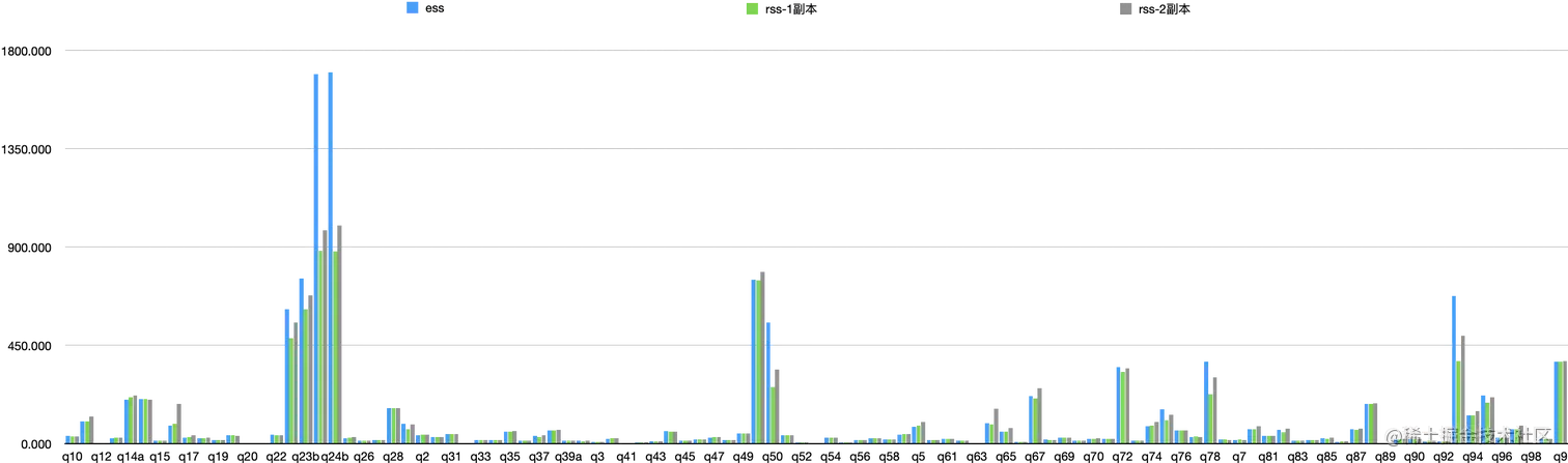 我们测试了10T的 TPCDS,E2E 来看,ESS 耗时11734s,RSS 单副本/两副本分别耗时8971s/10110s,分别比 ESS 快了23.5%/13.8%,如下图所示。我们观察到 RSS 开启两副本时网络带宽达到上限,这也是两副本比单副本低的主要因素。