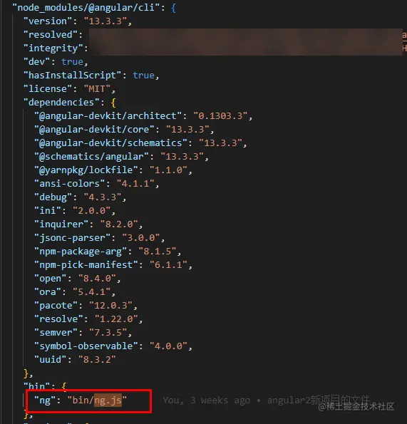 我们可以直接在项目根目录下的package-lock.json文件里搜索ng.js,可以看到npm在install的时候,就将bin/ng.js作为bin声明了: