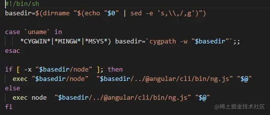 而在.bin目录下,一般针对一个依赖模块,会有3个可执行文件,没有后缀名的是对应Unix系的shell脚本,.cmd为后缀名的是windows bat脚本,.ps1为后缀名的则是PowerShell中可执行文件(可以跨平台),三者作用都是用node执行一个js文件。我们可以打开名为ng 的这个文件,看看里面的内容: