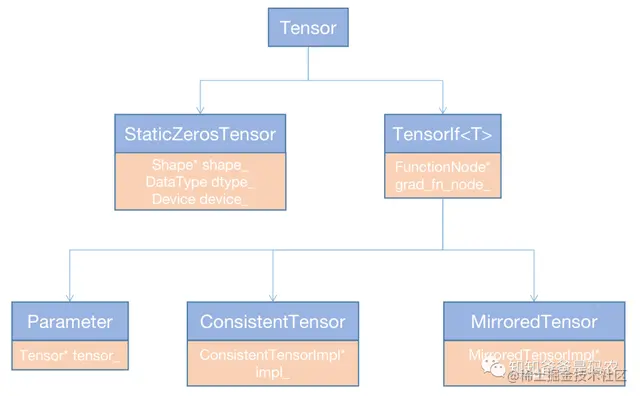 可见FunctionNode是挂在Tensor上的,通过Tensor的set_grad_fn_node接口维护到Tensor的数据结构中,在《OneFlow学习笔记:Consistent view的相关概念和实现》中画过Tensor的继承关系图,FunctionNode就是保存在TensorIf中: