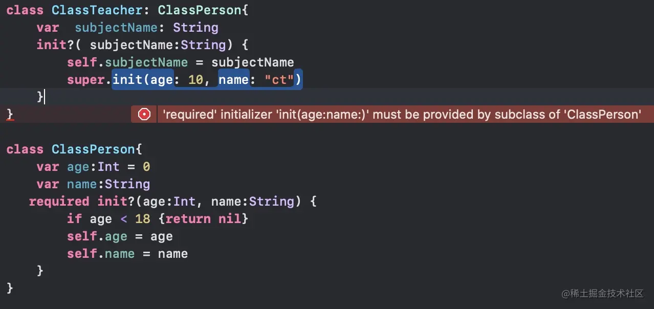 在类的初始化器前添加 required 修饰符来表明所有该类的子类都必须实现该初始化器