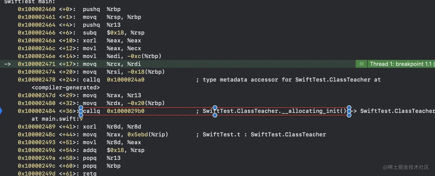 lldb指令si进入__allocating_init函数内部可以得出__allocating_init内部会调用swift_allocObject和init函数