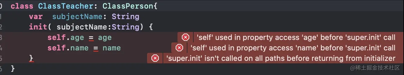 - 指定初始化器必须先向上委托父类初始化器,然后才能为继承的属性设置新值