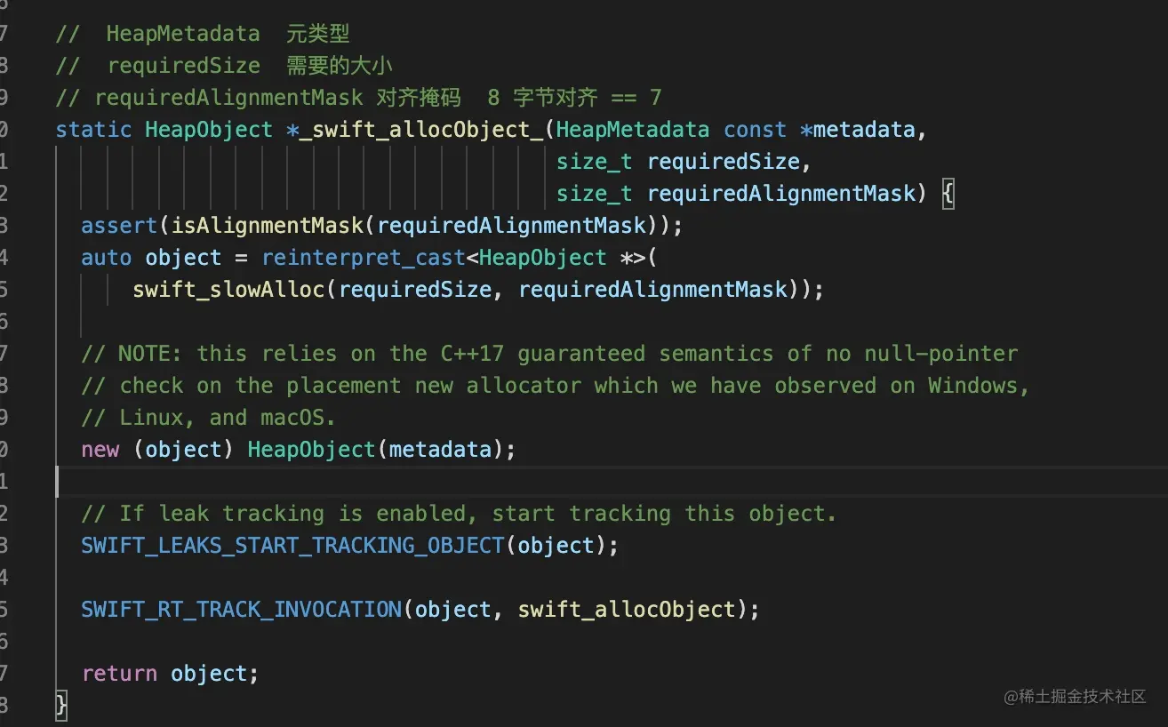 搜索 HeapObject.cpp 文件 找到 swift_allocObject 函数 可以看到 内部调用了 swift_slowAlloc 函数