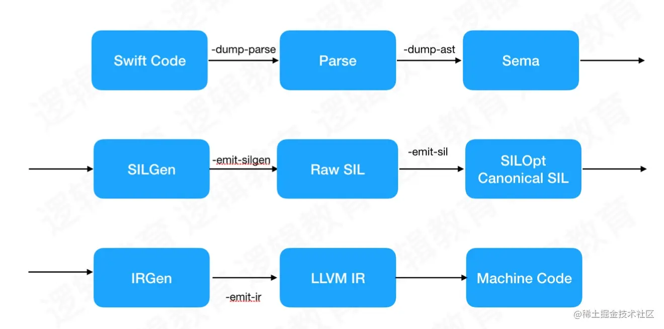 - Swift 则是通过 Swift 编译器编译成 IR,然后在生成可执行文件