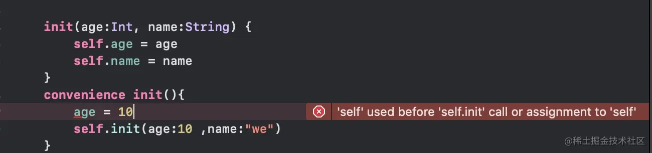 便捷初始化器必须先委托同类中的其它初始化器,然后再为任意属性赋新值(包括 同类里定义的属性)
