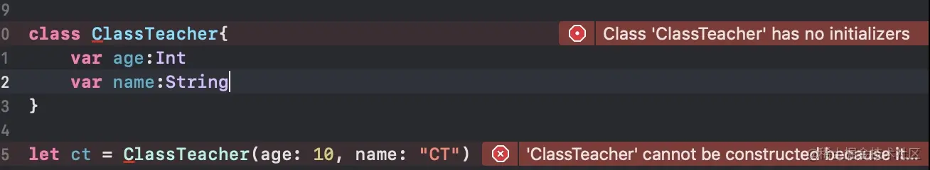 - 编译器不会自动提供类的初始化器,需要自己提供一个指定初始化器