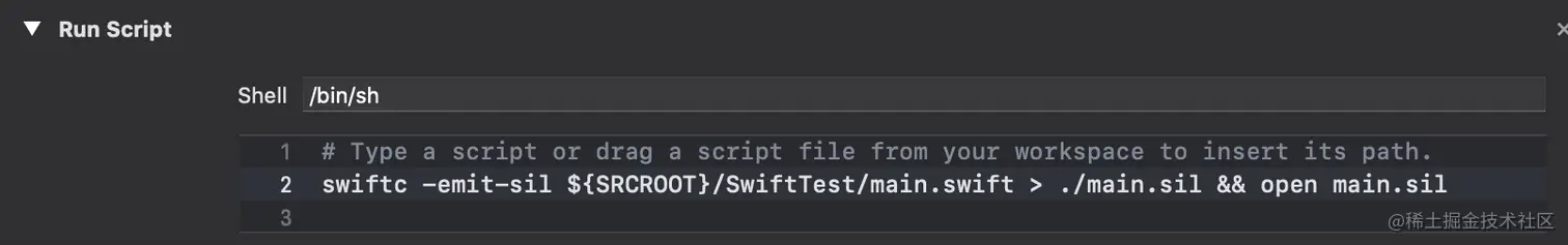 swiftc -emit-sil ${SRCROOT}/SwiftTest/main.swift > ./main.sil && open main.sil