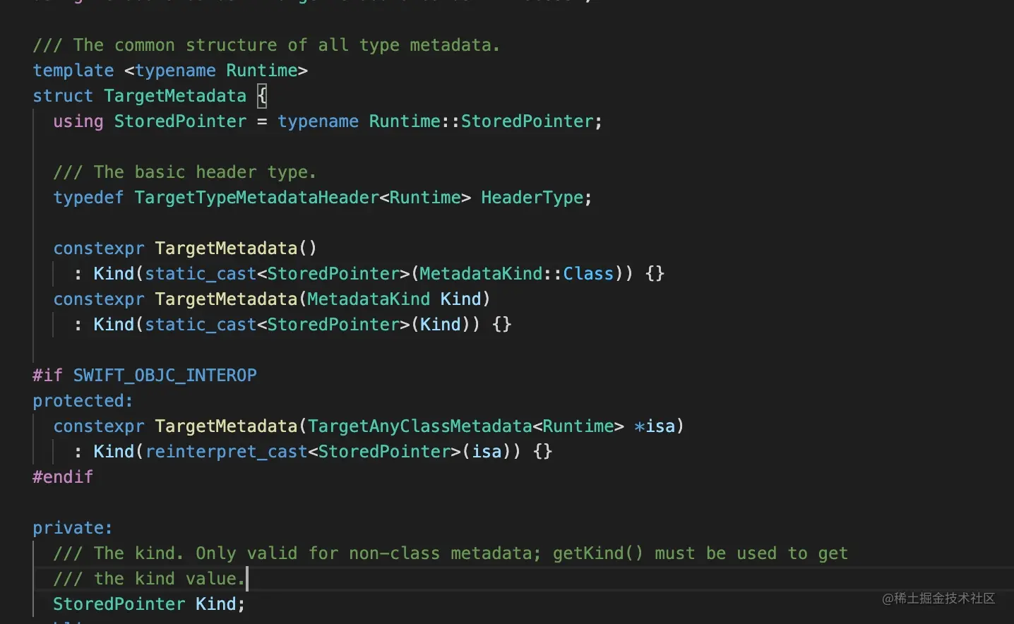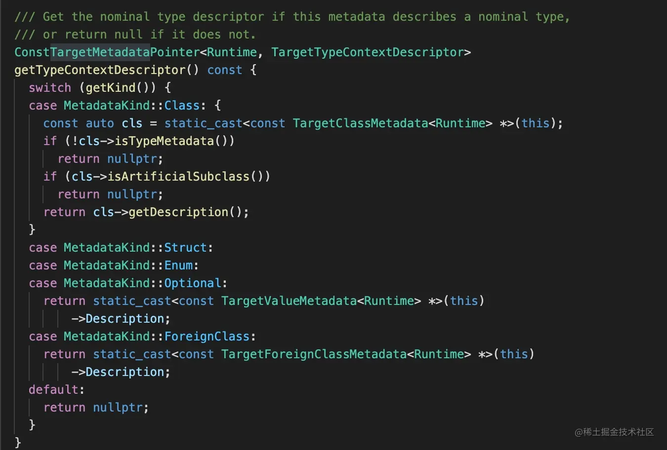 上面说到了 Metadata 最终继承自 TargetMetadata,且其成员中的 kind 对应多种类型,所以猜测 Metadata 最终会在这里完成创建 通过源码分析可以看到下面的这个函数