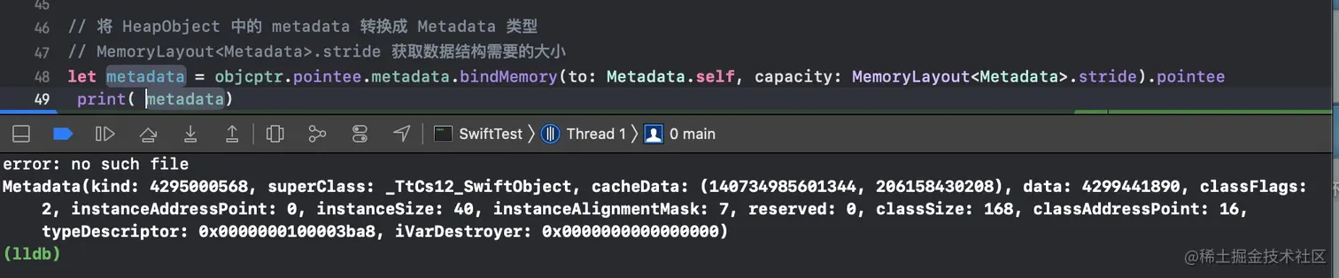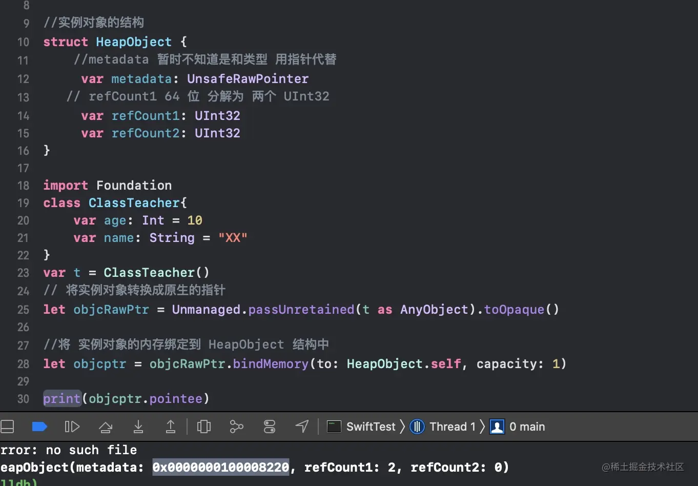 上面分析得到类的实例对象结构是 HeapObject 有两个属性: 一个是 Metadata ,一个是 RefCount