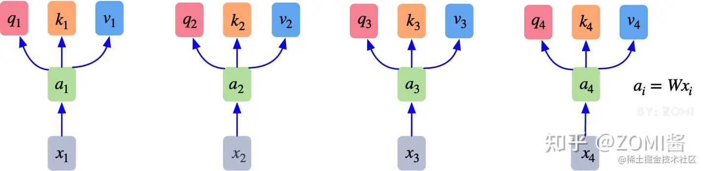 # 最初的输入向量首先会经过Embedding层映射成Q(Query),K(Key),V(Value)三个向量