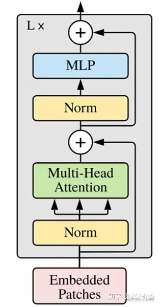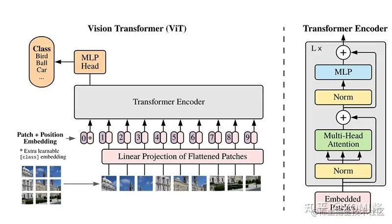 ViT模型的主体结构是基于Transformer模型的Encoder部分(部分结构顺序有调整,如:normalization的位置与标准Transformer不同),其结构图如下: