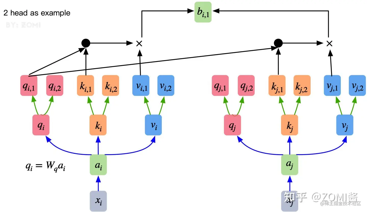所以,对于同一个输入向量,多个注意力机制可以同时对其进行处理,即利用并行计算加速处理过程,又在处理的时候更充分的分析和利用了向量特征。下图展示了多头注意力机制,其并行能力的主要体现在下图中的和是同一个向量进行分割获得的。