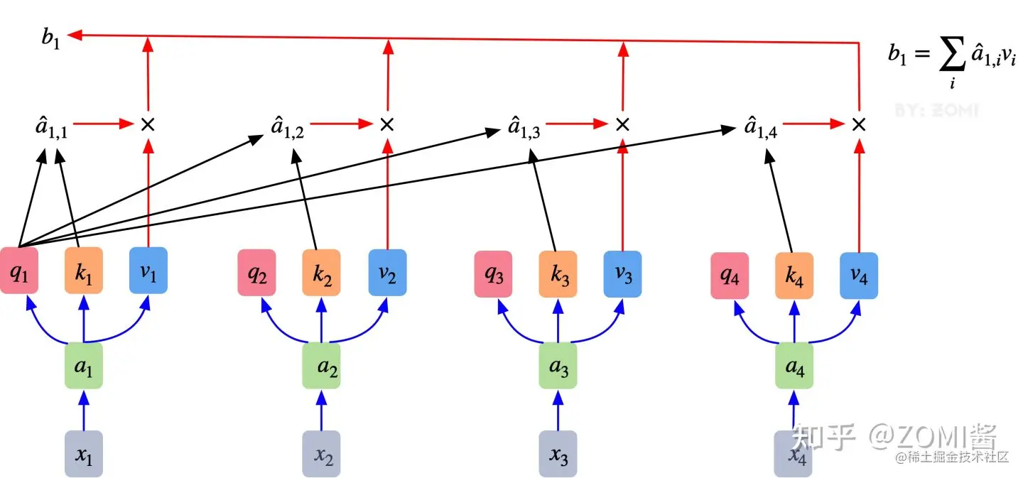 # 其最终输出则是通过V这个映射后的向量与QK经过Softmax结果进行weight sum获得