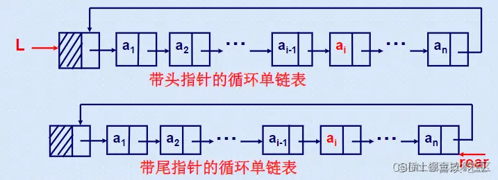 带头指针的循环链表需要遍历整个数组才能找到尾结点,而带尾指针的循环链表只需要.next就能找到头指针。