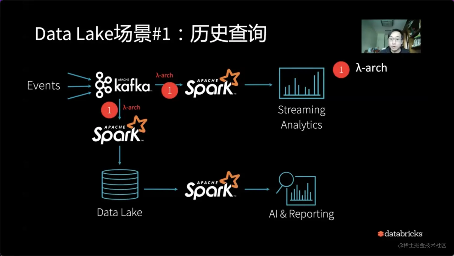 与此同时,需要离线流时,历史查询可以使用Lambda架构对应的方式。Apach Spark提供了很好的抽象设计,我们可以通过一种代码或API来完成流和实时的λ架构设计。