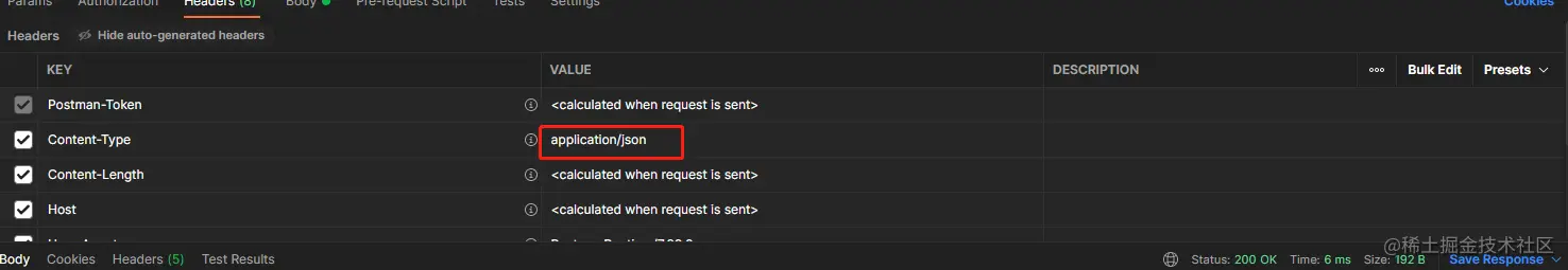 postman中选择body下的row 右侧类型选择JSON请求头会自动变成Content-Type:application/json,无需我们手动在去修改请求头🍬。