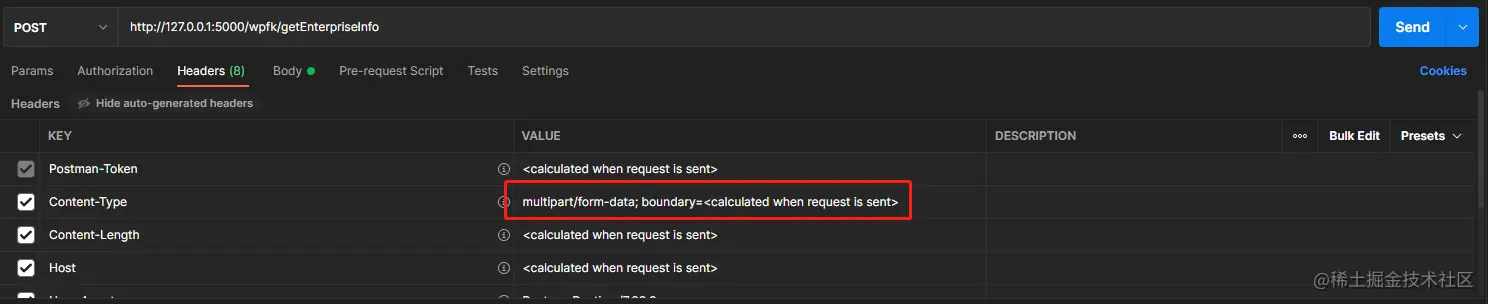 postman中选择body下form-data请求头会自动变成Content-Type:multipart/form-data,无需我们手动在去修改请求头🍤。