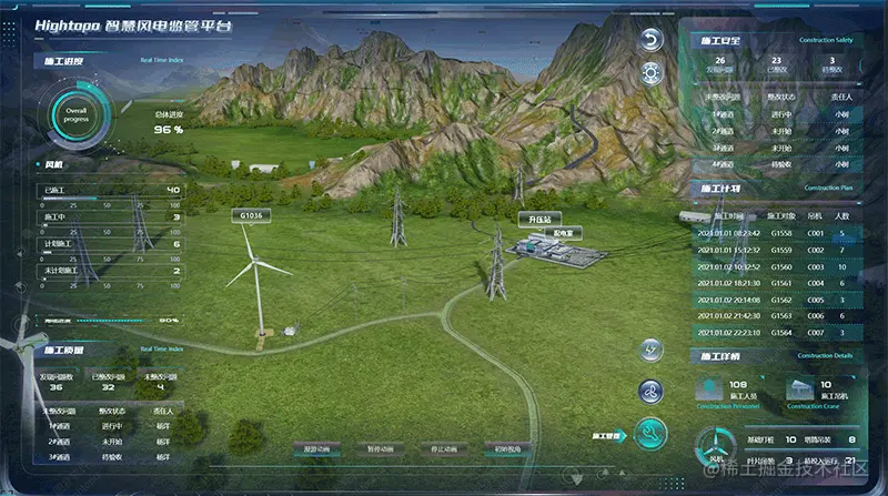 通过图扑软件可视化系统对风力发电机组施工进度、施工质量、施工安全、施工计划、施工详情的远程监控,可免去管理人员频繁到现场巡查的烦恼。