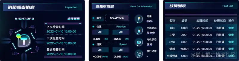 消防与巡检相辅相成,园区无人值守机器人巡检功能是电力行业的刚需,升压站内设置 AGV 巡检车辆,通过 HT for Web 渲染出的可视化界面可以实时查看车辆位置、行驶速度、电量、电池状态、运行状态等信息。