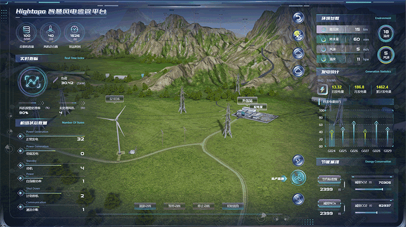 利用图扑软件的可视化场景将智能设备的实时运行参数接入两侧的 2D 面板,将项目概况、实时指标、机组状态、环境参数、发电统计、节能减排等复杂、抽象的数据以丰富的图表、图形和设计元素展现,实现集中管控。通过对历史数据的融合分析,管理者可实现资源的优化配置,构建智慧风电管理系统。