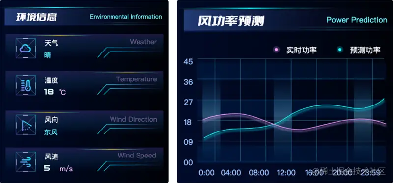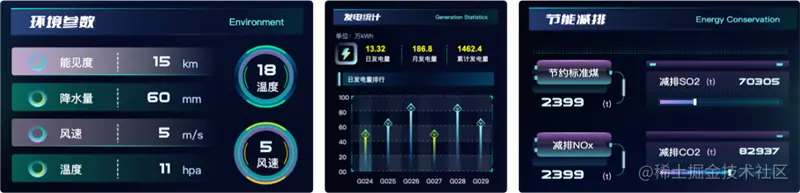 风力发电机因风量不稳定,且对电力系统运行的支撑能力不如其他发电领域,所以对风电基地设施的监测数据更需要具备时效性。将风电场的关键生产数据集中于界面的左右两侧,为管理人员提供直观的数据展示,及时掌控。