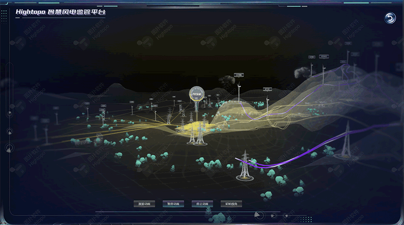 通过现场取景照片、卫星图、CAD 图等资料,Hightopo 可快速将现实的风电基地在线上进行还原,通过数据接入实现数字孪生。以流光效果模拟出不同风机集电线路电流向升压站汇聚的过程,更直观地展示风力发电流程,带来更好的沉浸体验、观看体验、交互体验。