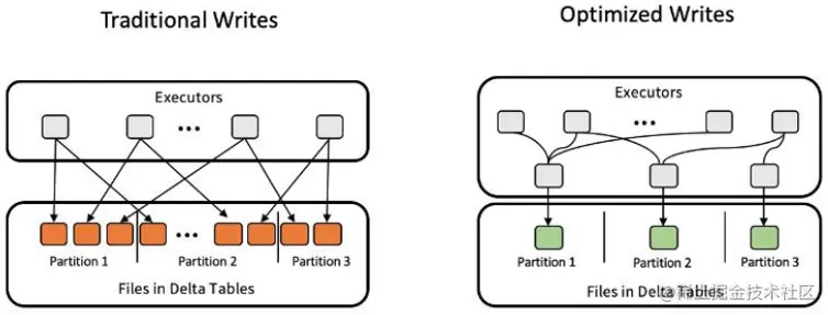 Databricks对Delta表的写入过程进行了优化,对每个partition使用一个专门的executor来合并其它executor对该partition的写入,从而避免了小文件的产生。