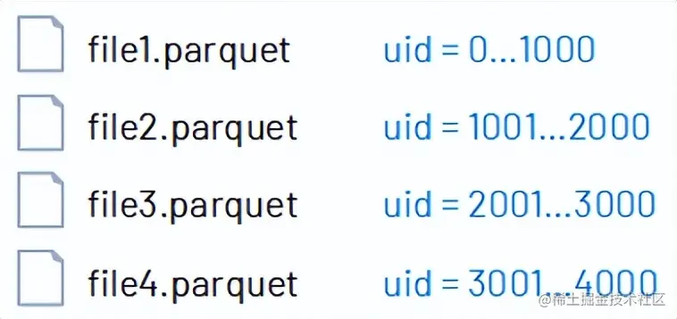 在Parquet文件中,维护表中每个数据文件的最小/最大值统计信息,有助于在查询发生时可以跳过一些无关的数据。