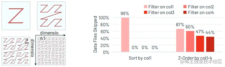 Z-Ordering可以在多个维度上(如下图的col 1-4)将关联的信息存储到同一组文件中,来减少不必要的文件读取。
