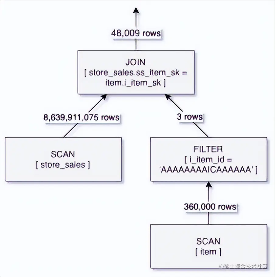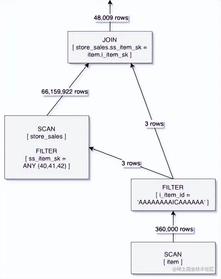 在启用DFP之后,会先扫描item表,查询出表item中i_item_id = ‘AAAAAAAAICAAAAAA'数据行,然后将这些数据行的i_item_sk值作为表store_sales的ss_item_sk的查询条件,在表store_sales的SCAN阶段进行过滤,跳过大量无关数据。这样仅扫描了660多万条store_sales中的数据,比未启用DFP时减少了近99%。