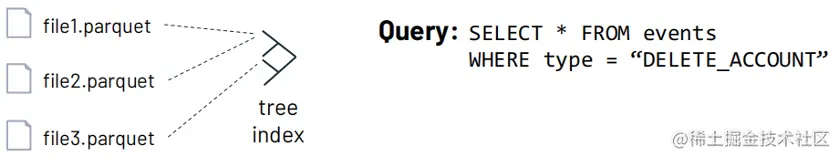 如下图,如果查询条件是type=“DELETE_ACCOUT”,可以利用在type上建立的索引直接跳到对应的数据上,从而避免读取无关数据。