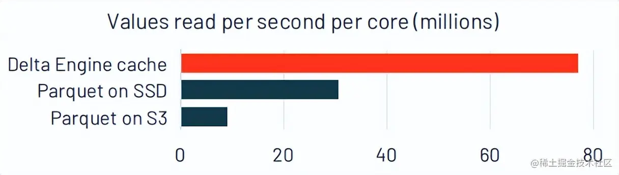 如图所示,在Databricks中用SSD作为缓存,可以将数据读取速度提高3倍以上;采用Delta引擎作为缓存,则可以将数据读取速度提高7倍以上。