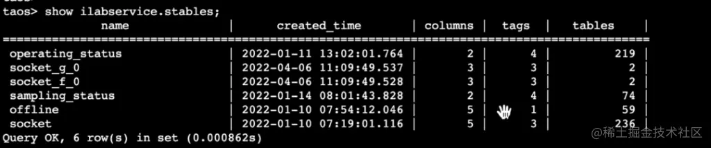 该环境的 TDengine 数据库服务版本为 2.2.2.15 单机模式,备份用其他方式完成。机器配置为 8C + 16G + 500G 机械硬盘。我们按照设备的原始数据、操作状态、样本状态,离线状态四个维度创建了“超级表—子表”的数据模型。