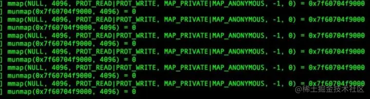 然后,使用 strace 去追踪系统调用。因为使用 gperftools 没有追踪到这些内存,于是直接使用命令“strace -f -e”brk,mmap,munmap” -p pid”追踪向 OS 申请内存请求,但是并没有发现有可疑内存申请。