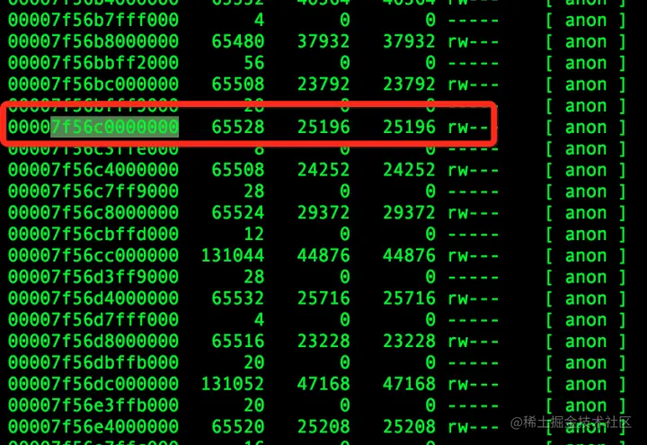 接着,使用 GDB 去 dump 可疑内存,因为使用 strace 没有追踪到可疑内存申请;于是想着看看内存中的情况。