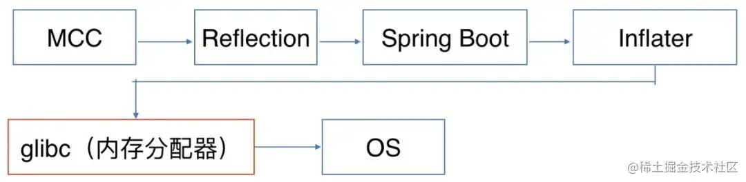 当发生 GC 的时候,SpringBoot 依赖于 finalize 机制去释放了堆外内存;但是 glibc 为了性能考虑,并没有真正把内存归返到操作系统,而是留下来放入内存池了,导致应用层以为发生了“内存泄漏”。所以修改 MCC 的配置路径为特定的 JAR 包,问题解决。