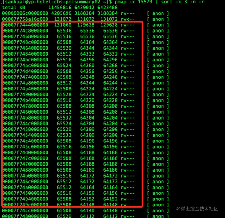 为了防止误判,笔者使用了 pmap 查看内存分布,发现大量的 64M 的地址;而这些地址空间不在 jcmd 命令所给出的地址空间里面,基本上就断定就是这些 64M 的内存所导致。