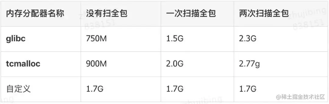 笔者做了一下测试,使用不同分配器进行不同程度的扫包,占用的内存如下: