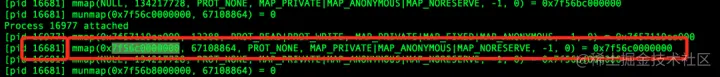 再次,项目启动时使用 strace 去追踪系统调用,项目启动使用 strace 追踪系统调用,发现确实申请了很多 64M 的内存空间。