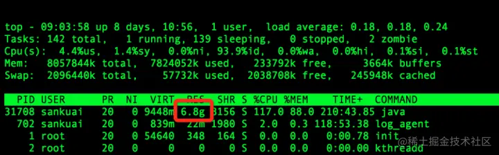 笔者被叫去帮忙查看原因,发现配置了 4G 堆内内存,但是实际使用的物理内存竟然高达 7G,确实不正常。
