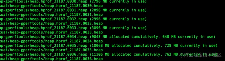 这时,再返过来看 gperftools 的内存分布情况,发现使用 SpringBoot 时,内存使用一直在增加,突然某个点内存使用下降了好多(使用量直接由 3G 降为 700M 左右)。