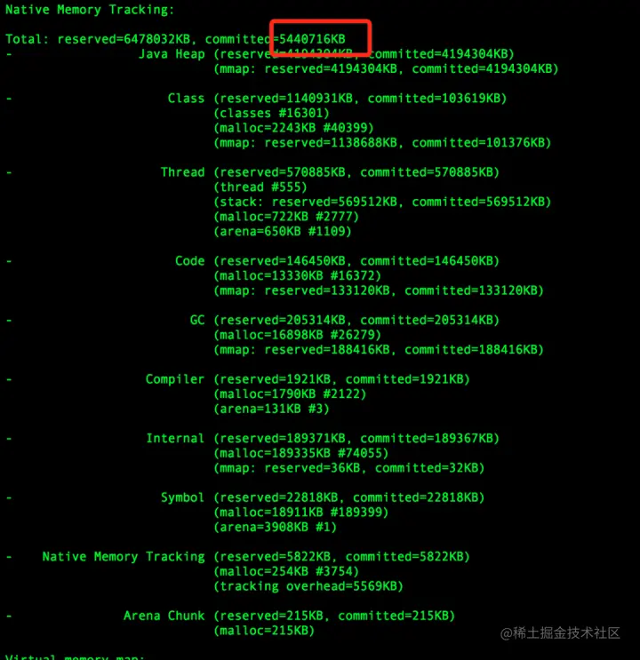 笔者在项目中添加 -XX:NativeMemoryTracking=detailJVM 参数重启项目,使用命令 jcmd pid VM.native_memory detail 查看到的内存分布如下: