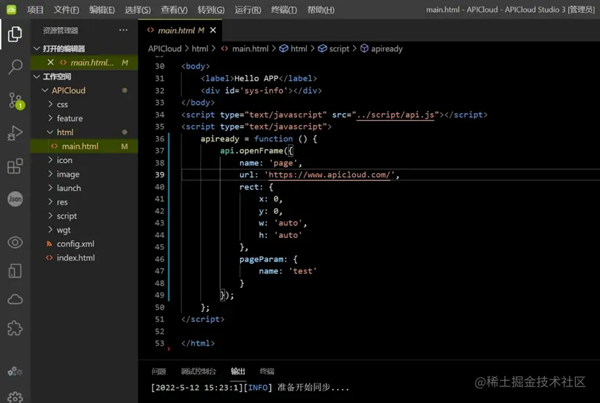 然后在APICloud Studio 3(可在www.apicloud.com/studio3下载)中… 用 api.openFrame 打开网址,如图所示: