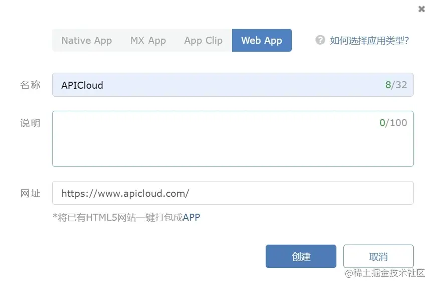 首先,进入APICloud官网www.apicloud.com并完成注册。进入开发控制台,点击创建应用,选择Web App,填入应用名称和网址,就可以轻松创建应用。